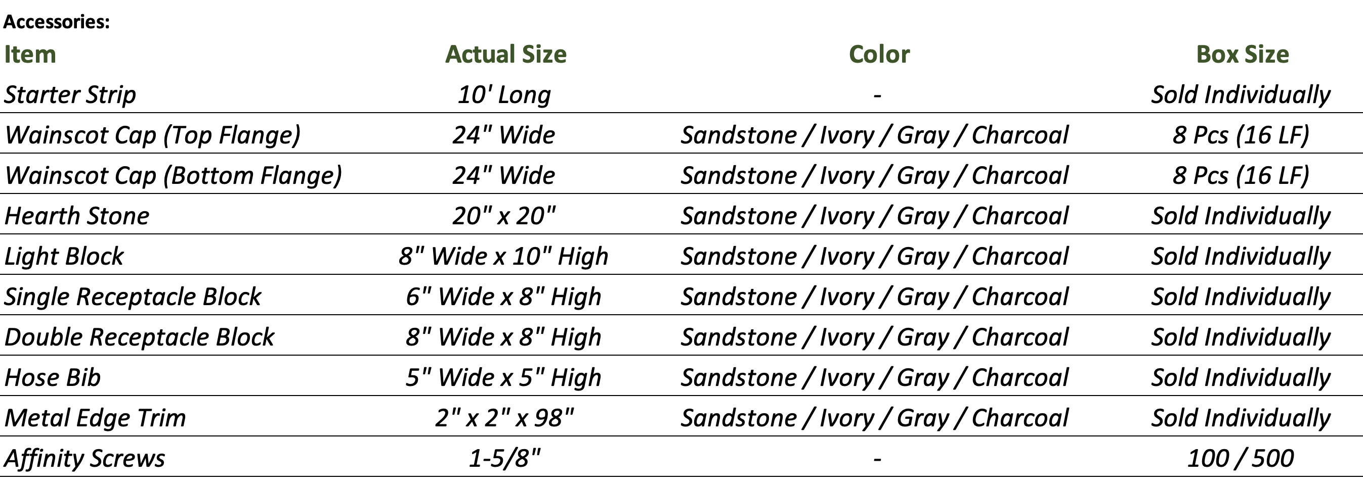 A: Affinity has a suite of products and accessories that includes a starter strip, wainscot cap, column kits, light and receptacle boxes, and cap stones. It's one of the few stone veneer products that have a full system, ensuring that every job can be professionally done.