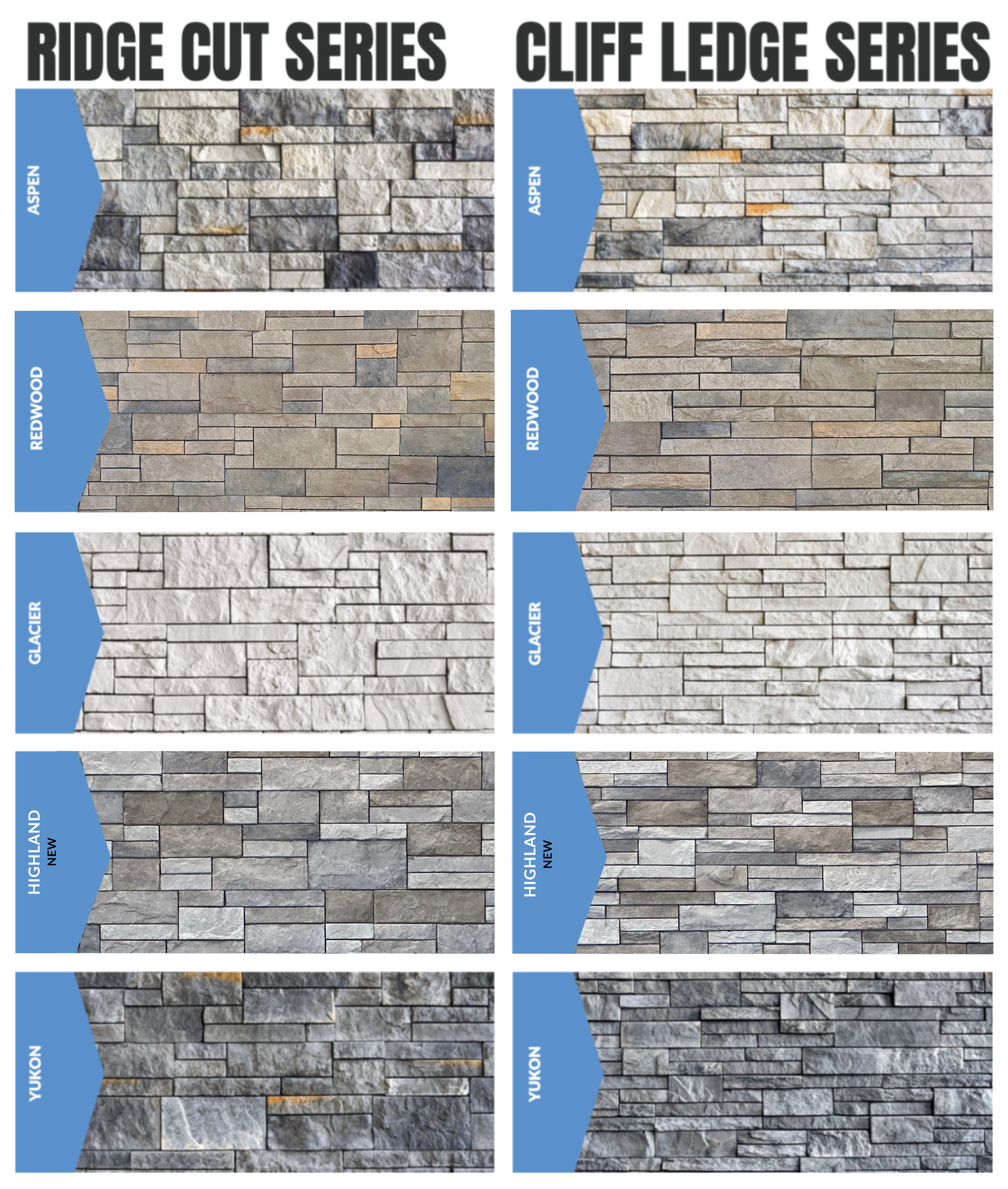 A: All five affinity colors are available, and in both the Ridge Cut and Cliff Ledge profiles.