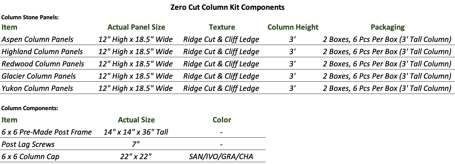 A: Yes, there are pre-made, zero cut column kits available. These are designed to go around a 6x6 post and come with pre-designed post framing, perfectly sized stone panels, and a column cap. No cutting is required to install these, just screw fastening. These columns measure 18.5" x 18.5", and are 3' tall. This speeds up installation time and dramatically improves appearance as every column is perfectly sized for a high quality appearance.