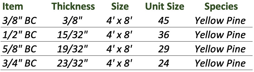 B-grade sanded veneer face, C-grade cores, and back, exterior glue. BC plywood Pine will have a repaired face that has removed any knots or other defects. Applications include exterior sheathing, soffits, cabinets, shelving, and paneling.