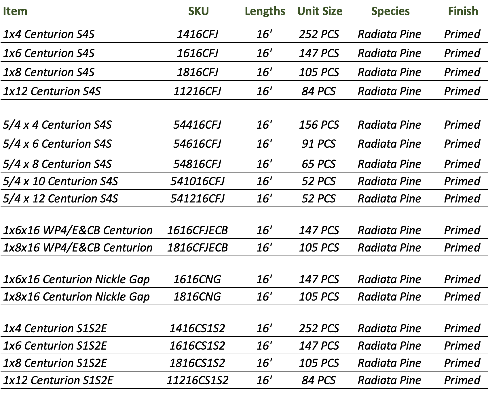 Centurion® is a finger jointed Radiata Pine that is fully primed and fully treated for both interior and exterior use. Their Tru-Core® treatment technology treats the board throughout and protects against rot, decay, and insects, and is backed by a 50 year warranty. It is a excellent choice for those doing fine exterior trim work and paneling, and those looking for a best-in-class pre-primed trim and pattern.