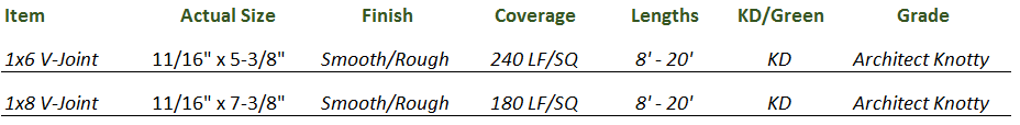 Applications: Exterior siding, porch and vaulted ceilings, interior paneling, cabinets